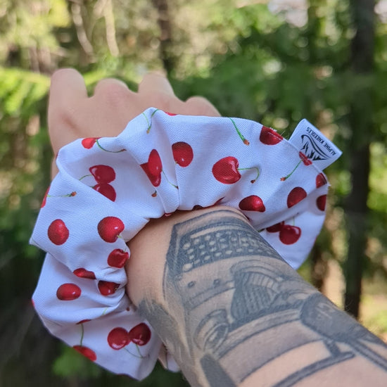 Sweet with a little kick — Cherry Bomb is our cotton scrunchie in the Maple size, featuring a classic cherry pattern on a clean white background.