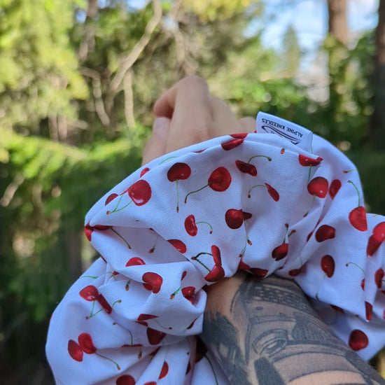 Playful, nostalgic, and a little bold — Cherry Bomb is our oversized cotton scrunchie in the Redwood size, featuring a crisp white background dotted with vibrant red cherries.