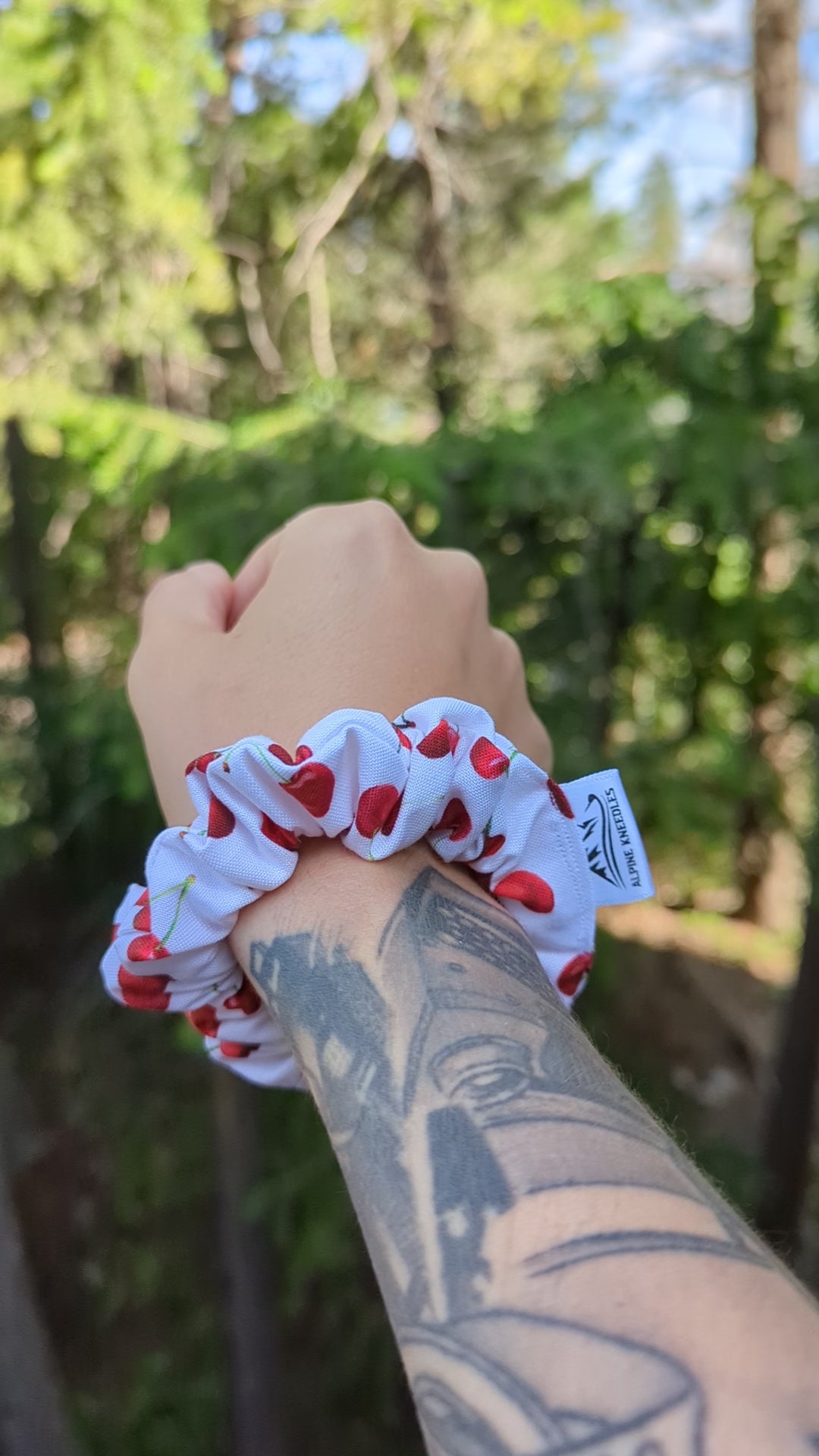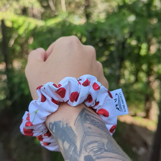 Small but full of charm — Cherry Bomb in our Sapling size is the mini version of our scrunchies, designed for half-up styles, fine hair, or people who love a little pop of fun.