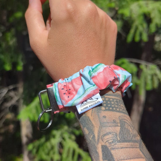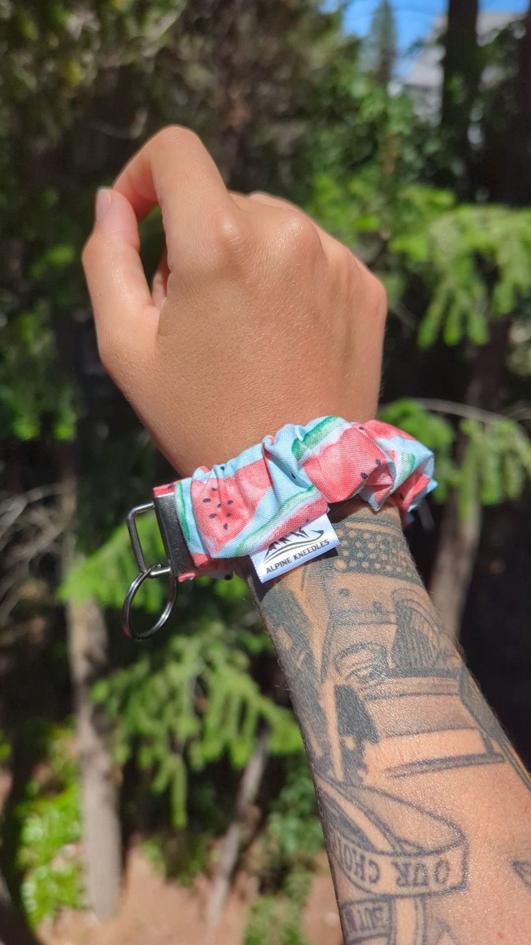 Bring juicy summer vibes with you wherever you go with Squeeze the Day, a cheerful scrunchie-style wristlet made from soft cotton fabric featuring playful watermelon slices on a fresh blue background.
