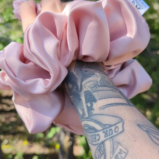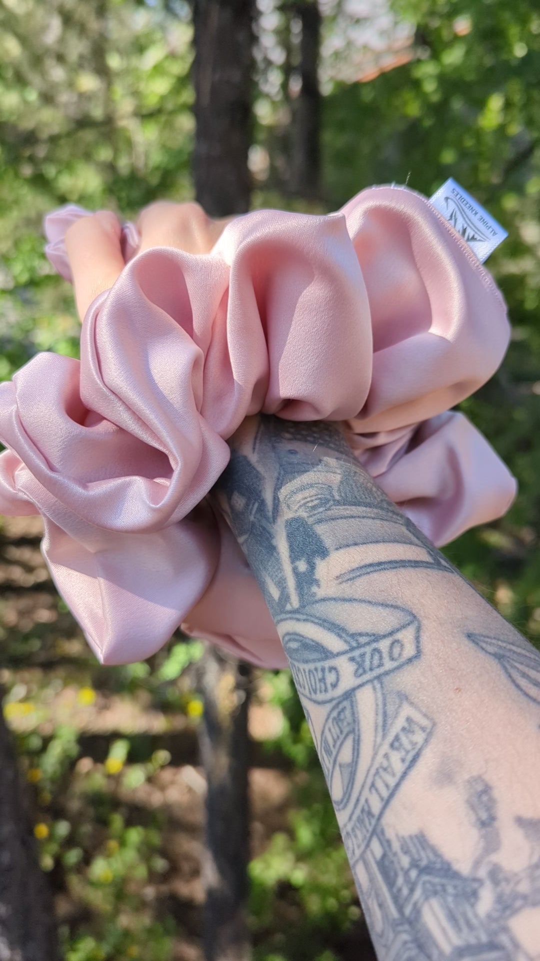 Say hello to *Pink Lily*—a handmade satin scrunchie in a soft, romantic **blush** tone, designed in our **Redwood size** for that bold, voluminous look you love.