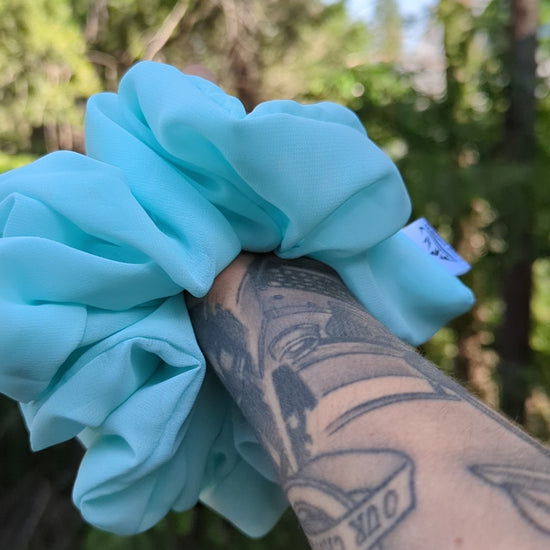 Soft as a mountain breeze and coloured like the still waters of Lake Moraine, Tranquility is our oversized chiffon scrunchie in the Redwood size — made for hair that loves a gentle hold with a hint of elegance.